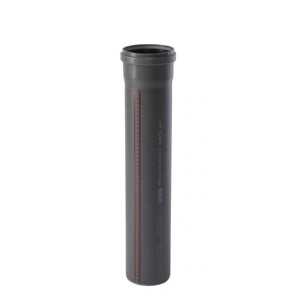 HTsafe-Rohr aus schwer entflammbarem PP-H nach DIN 4102 (B1) mit einseitiger Steckmuffe und 3-fach-Dichtlippe. Eignet für die Abwasserleitung innerhalb von Gebäuden nach DIN EN 1451. Das Rohr ist für heiße, kalte und aggressive Abwässer sowie für Zentralstaubsaugeranlagen geeignet.
