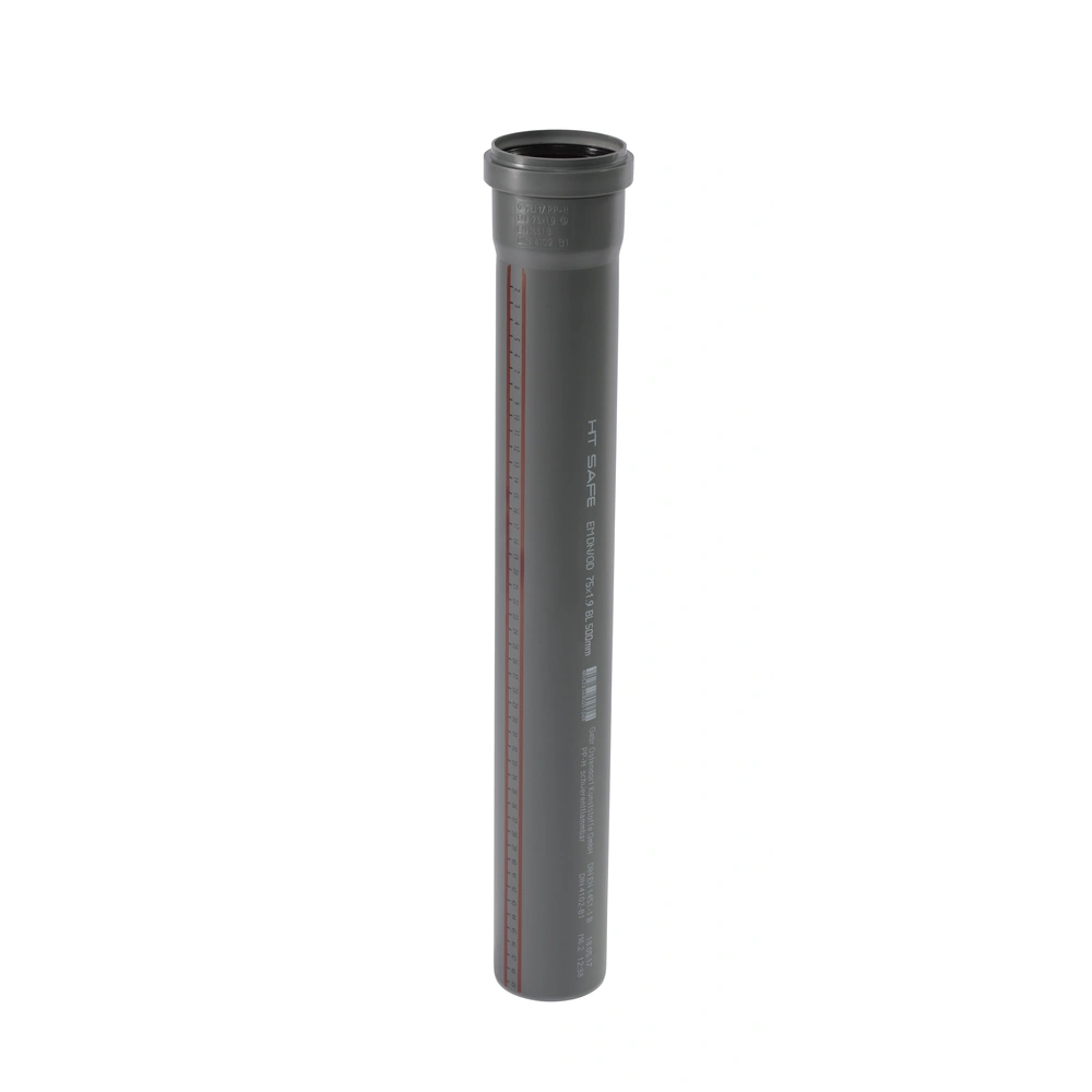 HTsafe-Rohr aus schwer entflammbarem PP-H nach DIN 4102 (B1) mit einseitiger Steckmuffe und 3-fach-Dichtlippe. Eignet für die Abwasserleitung innerhalb von Gebäuden nach DIN EN 1451. Das Rohr ist für heiße, kalte und aggressive Abwässer sowie für Zentralstaubsaugeranlagen geeignet.