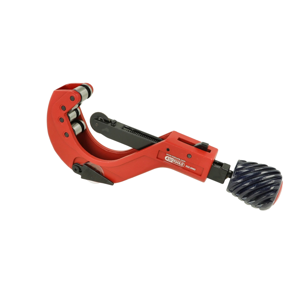 Rohrabschneider für Kunststoffrohre. Der Schneider verfügt über einen ausklappbaren Innen-Entgrater und eine Schnellverstellung mit automatischem Federrückzug. Ein Ersatzschneidrad ist im Griff enthalten.