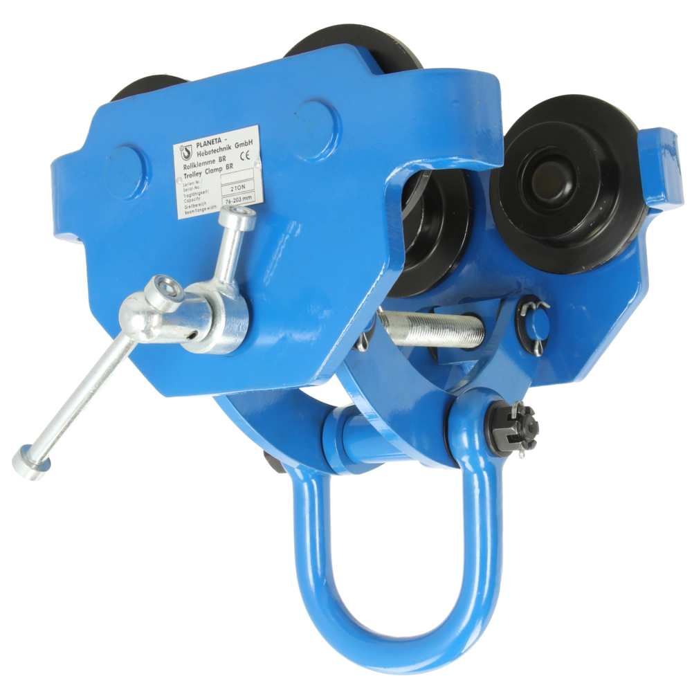 Trägerklemme mit Rollfahrwerk zum Bewegen von Lasten an Deckenträgern. Durch Drehen an der Gewindespindel stellen Sie die Klemme auf die Größe des Trägers ein. Der Konterhebel wird zur Sicherung gegen das Seitenschild gedreht...
