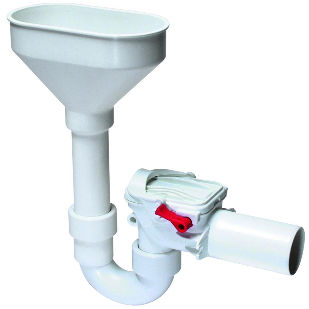 KESSEL-Rückstaudoppelverschluss Staufix Siphon DN50 aus Kunststoff, mit zwei selbsttätig schließenden Klappen, eine davon als handverriegelbarer Notverschluss. Mit Wandbefestigung, Röhrengeruchsverschluss und Einlauftrichter für Tropfwasseranschluss. Ablauf DN50 waagerecht zum Anschluss an HT-Rohr nach DIN 19560.