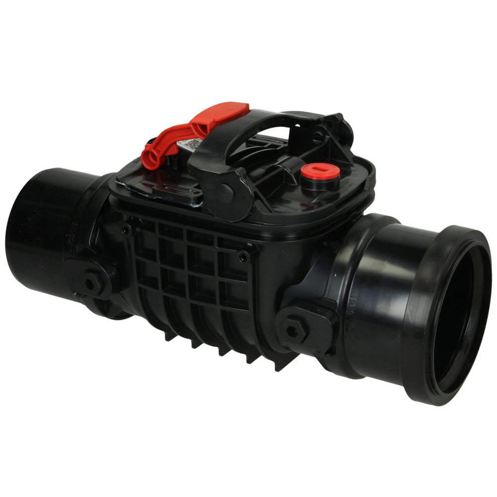 KESSEL-Rückstauverschluss Staufix für fäkalienfreies Abwasser, aus Kunststoff. Mit zwei selbsttätig schließenden Klappen, eine davon als handverriegelbarer Notverschluss.
