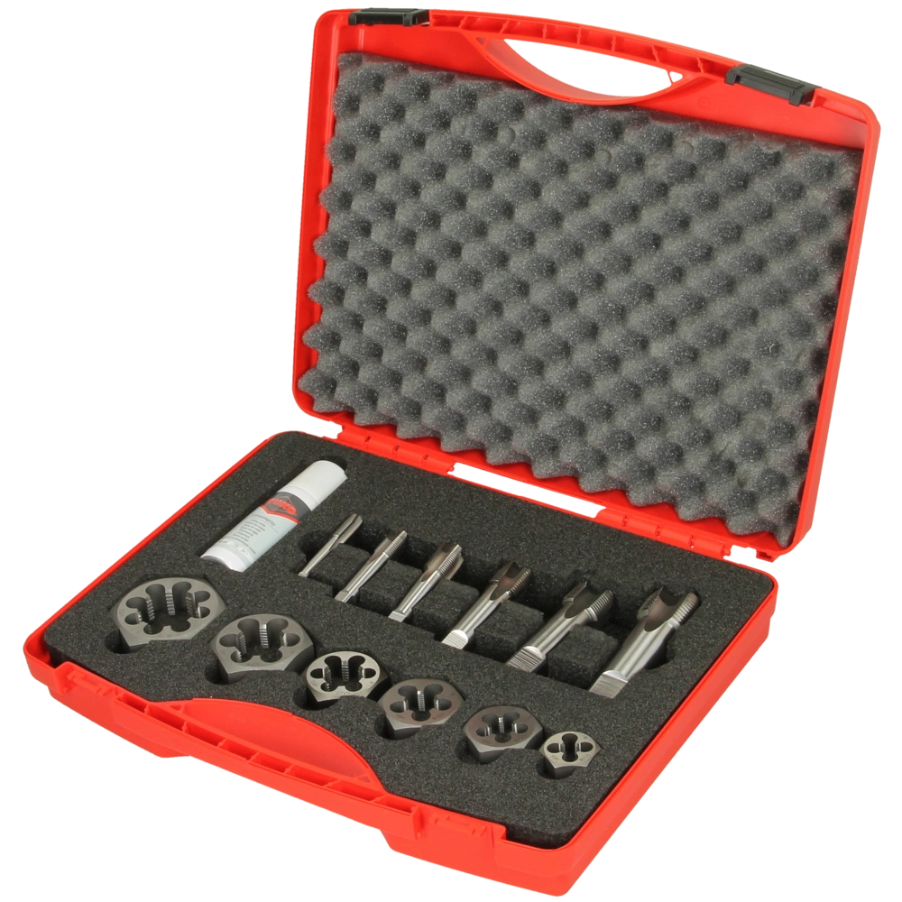 Mit dem Ruko Sanitär-Reparatur-Gewindeschneidwerkzeug-Satz im Kunststoffkoffer haben Sie immer das richtige Werkzeug für Sanitärinstallationen zur Hand. Die Gewindebohrer sind für Durchgangsgewinde, in unlegierten und niedriglegierten Stählen bis 800 N/mm² Festigkeit sowie für Durchgangsgewinde, in legierten und unlegierten Stählen bis 1000 N/mm² Festigkeit, Temperguss und NE-Metallen geeignet. Das Gewinde wird in drei Arbeitsgängen geschnitten.