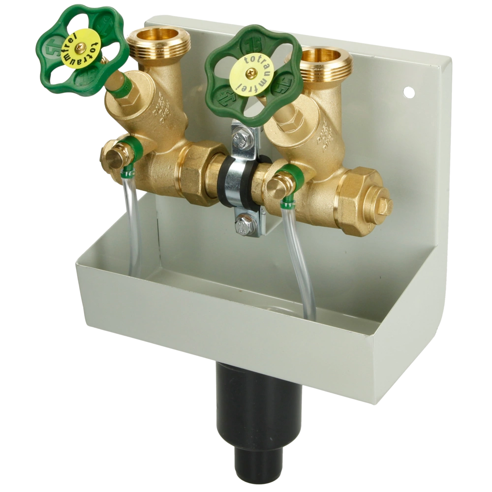 Sanitär Kompaktverteiler mit Ablaufwanne. Der Verteiler besitzt ein KFR-Ventil und Freistromventile mit Kappe, Stopfen, Befestigung und Etiketten. Die pulverbeschichtete Wanne enthält einen Geruchsverschluss.