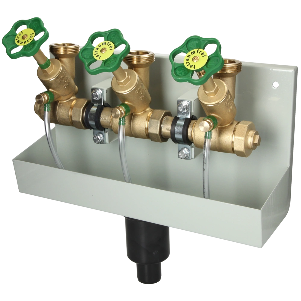 Sanitär Kompaktverteiler mit Ablaufwanne. Der Verteiler besitzt ein KFR-Ventil und Freistromventile mit Kappe, Stopfen, Befestigung und Etiketten. Die pulverbeschichtete Wanne enthält einen Geruchsverschluss.