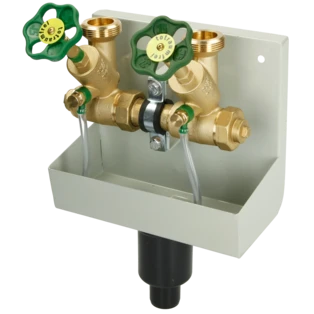 Sanitär-Kompaktverteiler mit Ablaufwanne. Die Verteiler besitzen KFR-Ventile und Freistromventile mit Kappe, Stopfen, Befestigung und Etiketten. Die pulverbeschichtete Wanne enthält einen Geruchsverschluss.