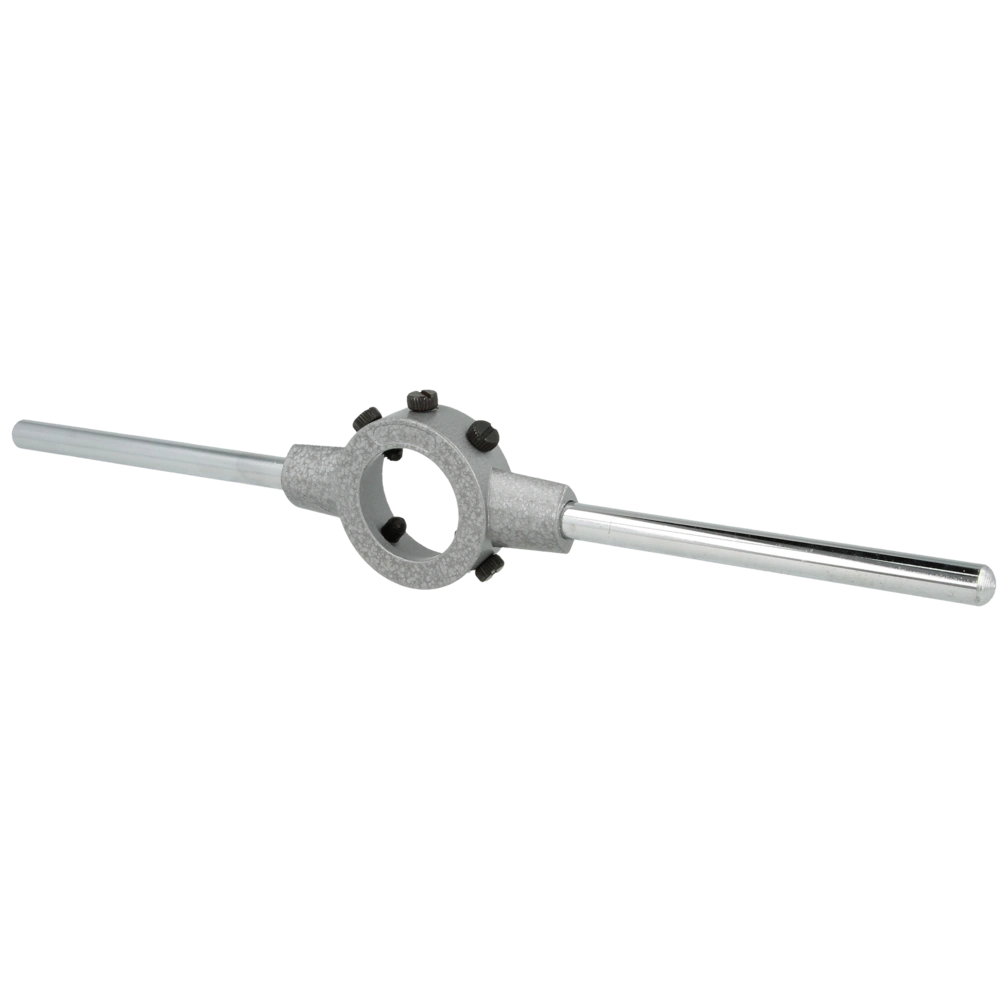 Schneideisenhalter nach DIN 225 mit abschraubbarem Stahlgriff zur Aufnahme geschlossener und geschlitzter Schneideisen nach DIN EN 24231.