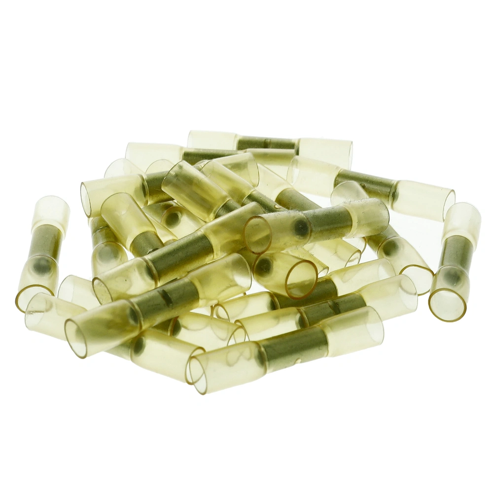 Praktische Warmschrumpf-Quetschverbinder zur einfachen und sicheren Verbindung von Leitungen. Durch die Schrumpfschlauchisolation ist die Verbindung 100% wasserdicht.
