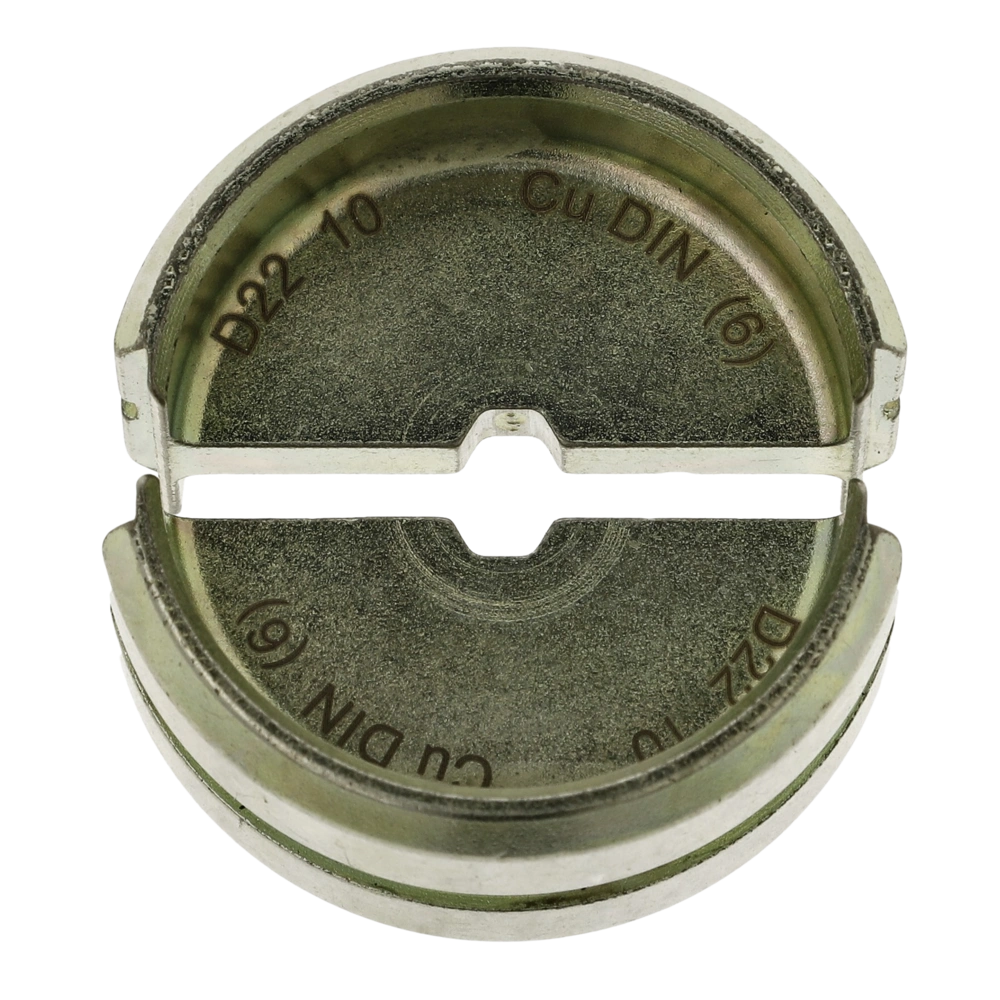 Pressbacken-Einsatz zur Verarbeitung von Rohrkabelschuhen mit einer Pressmaschine. Um die richtige Kontur zu pressen, werden die beiden Halbschalen einfach seitlich in die Universal-Pressbacke eingeschoben und arretiert.
