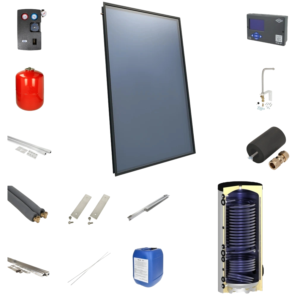 Komplettes Solarpaket mit 4plus Solar-Kollektoren in patentierter Wärmeleittechnologie, passendem Speicher, Montagesystem und umfangreiches Zubehör zur schnellen und sicheren Montage. Die bewährten, hochwertigen Einzelkomponenten sichern eine lange Lebensdauer und Zuverlässigkeit der Anlage.