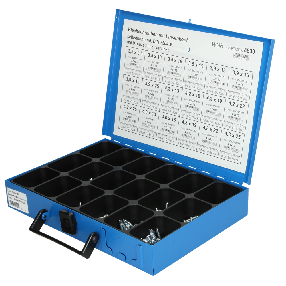 Alle Produktinformationen LieferumfangDer 900-teilige Sortimentskasten aus Metall mit herausnehmbarem Einsatz bietet für 18 unterschiedliche Schraubengrößen Platz. Die Schrauben mit Linsenkopf sind selbstbohrend, galvanisiert und verzinkt. Dank der Beschriftung am Kastendeckel ist sofort die passende Schraube griffbereit. Es handelt sich um ein Qualitätsprodukt aus dem Hause Dresselhaus.