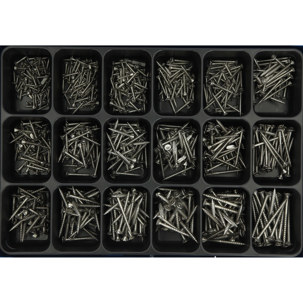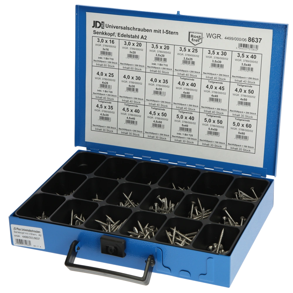 Alle Produktinformationen LieferumfangDer Sortimentskasten ist mit Edelstahl-Senkkopf-Universalschrauben bestückt.