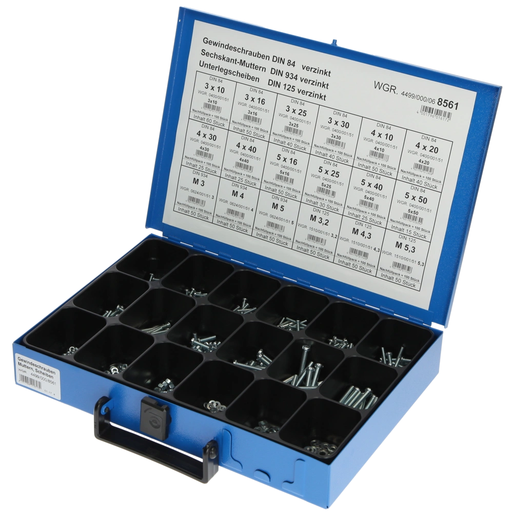 Alle Produktinformationen LieferumfangDas Sortiment mit Zylinderschrauben, Muttern und Unterlegscheiben wird in einem verzinkten Blechkasten mit 18 Fächern geliefert und bietet Ihnen somit eine Vielzahl der gängigen Zylinderschrauben auf einen Griff.