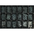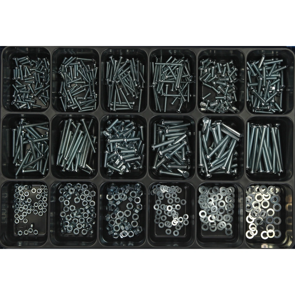 Das Sortiment mit Zylinderschrauben, Muttern und Unterlegscheiben wird in einem verzinkten Blechkasten mit 18 Fächern geliefert und bietet Ihnen somit eine Vielzahl der gängigen Zylinderschrauben auf einen Griff.