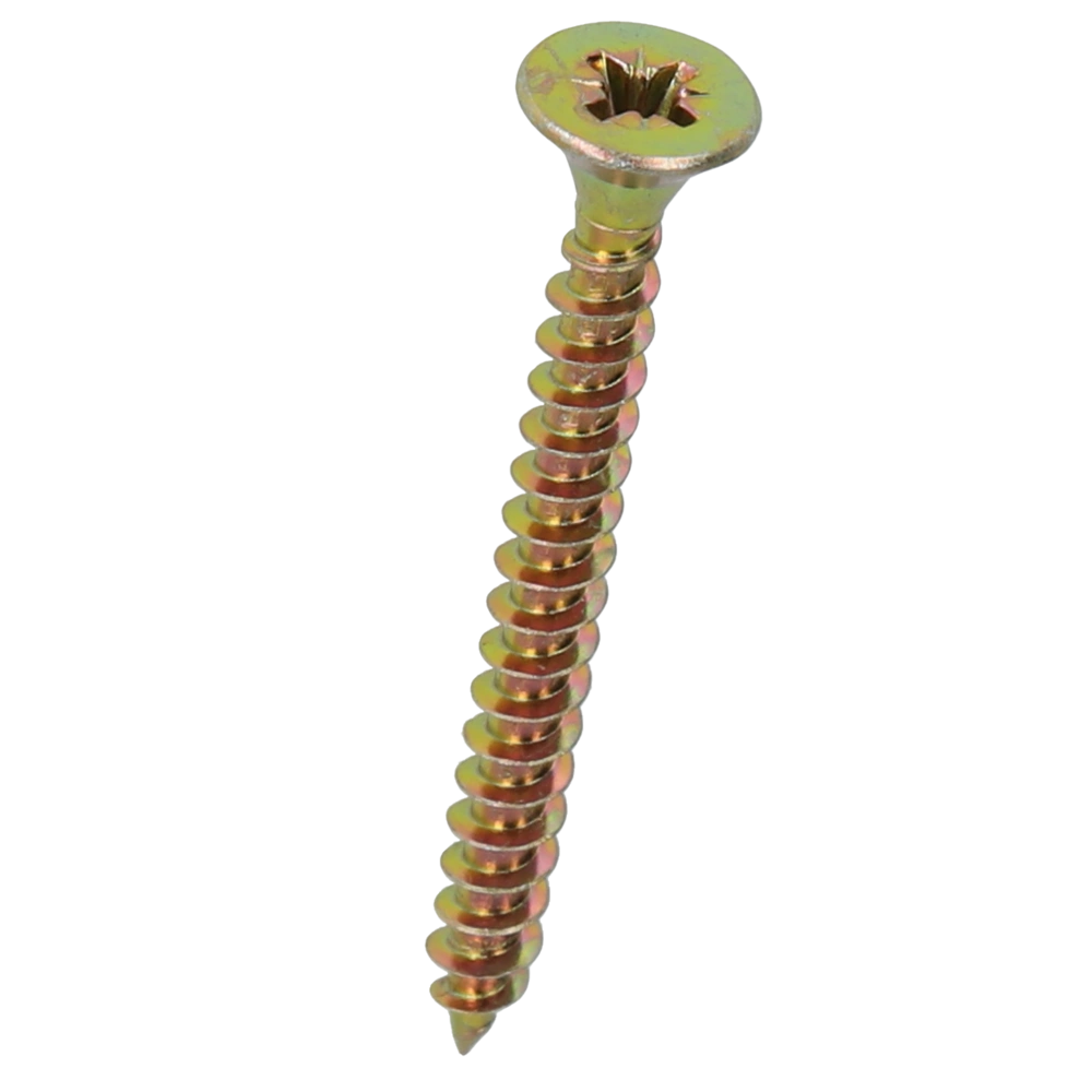 Galvanisch verzinkte und gelb chromatierte Senkkopfschraube mit Vollgewinde für den universellen Einsatz in Hartholz, Spanplatten und Kunststoff.