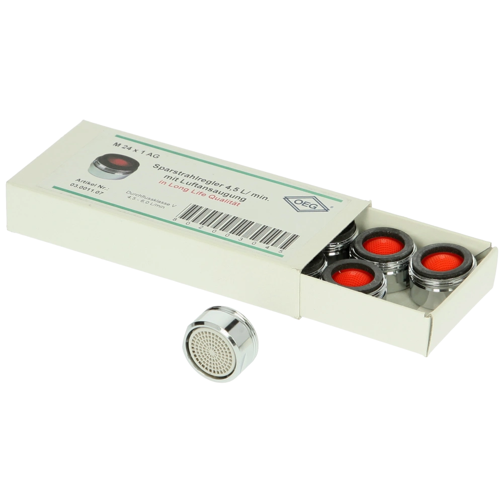Spar-Strahlregler mit Schmutzfangsieb und angespritzem Antikalksieb. Durch die Belüftung entsteht ein angenehm weicher und spritzfreier Komfortstrahl.