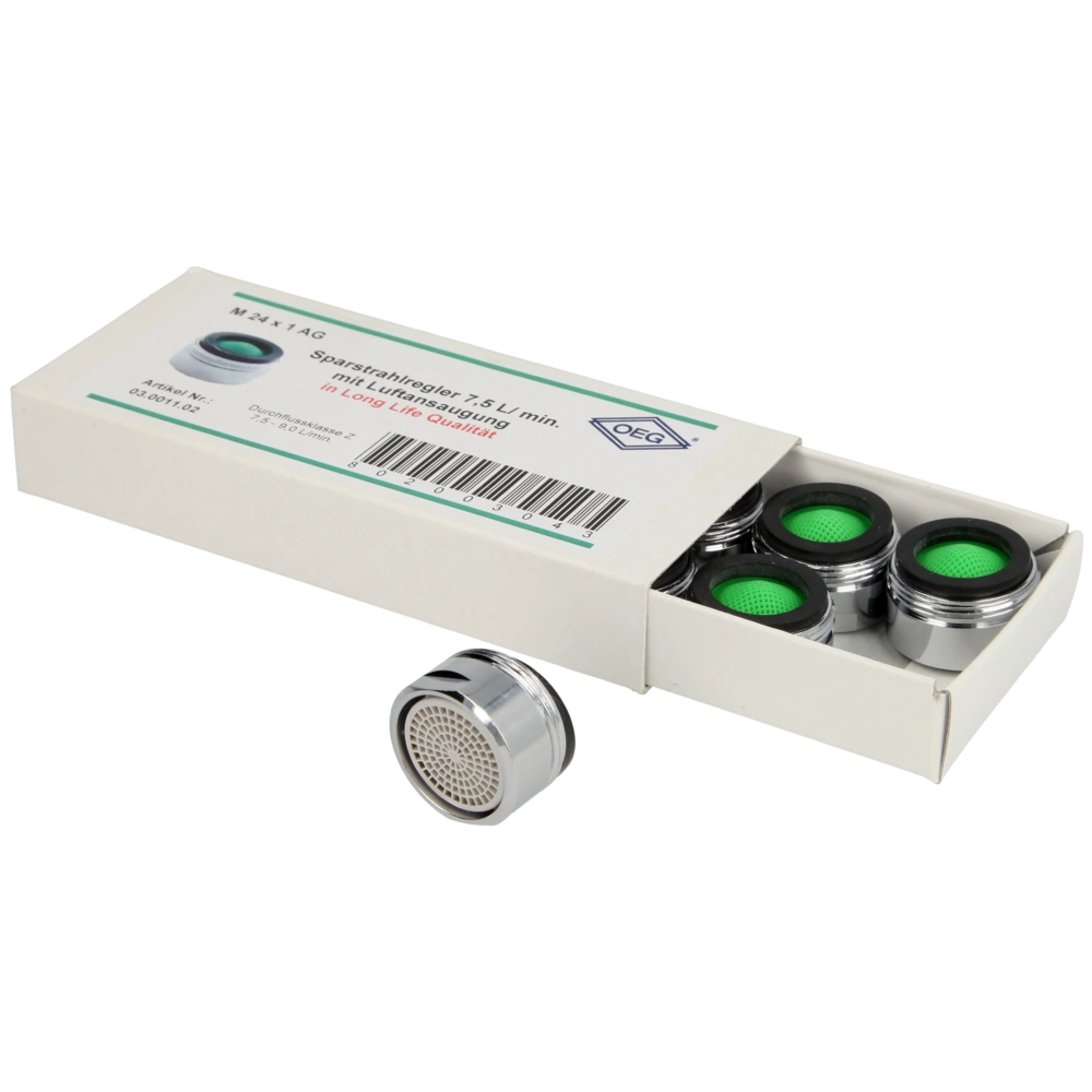Spar-Strahlregler mit Schmutzfangsieb und angespritzem Antikalksieb. Durch die Belüftung entsteht ein angenehm weicher und spritzfreier Komfortstrahl.