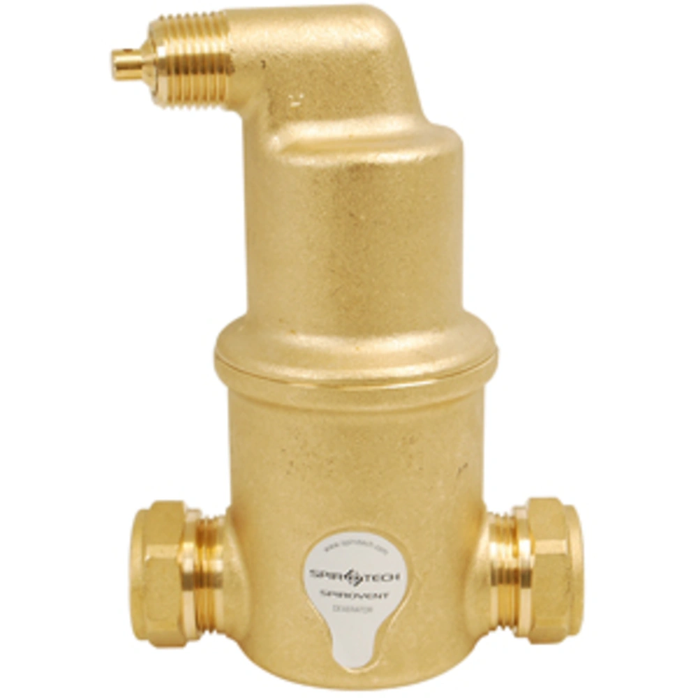 Alle ProduktinformationenLuftabscheider für die zuverlässige Entfernung von feinsten Luftbläschen in Heizungs-, Kühl- und Prozessanlagen. Durch das spezielle, mit Kupferdrahtgeflecht ummantelte Spirorohr® werden selbst kleinste Luftbläschen im Hauptstrom gebremst und steigen auf. Die so abgeschiedene Luft wird über das automatische, leckfreie Ventil nach außen abgeführt. Dadurch entsteht eine völlig mikroblasenfreie Zirkulation in der Anlage, womit eine einwandfreie Funktion ohne Wartung, manuelles Entlüften und störende Geräusche gewährleistet wird. Der Einbau des SpiroVent sollte horizontal an der heißesten Stelle des jeweiligen Systems erfolgen.