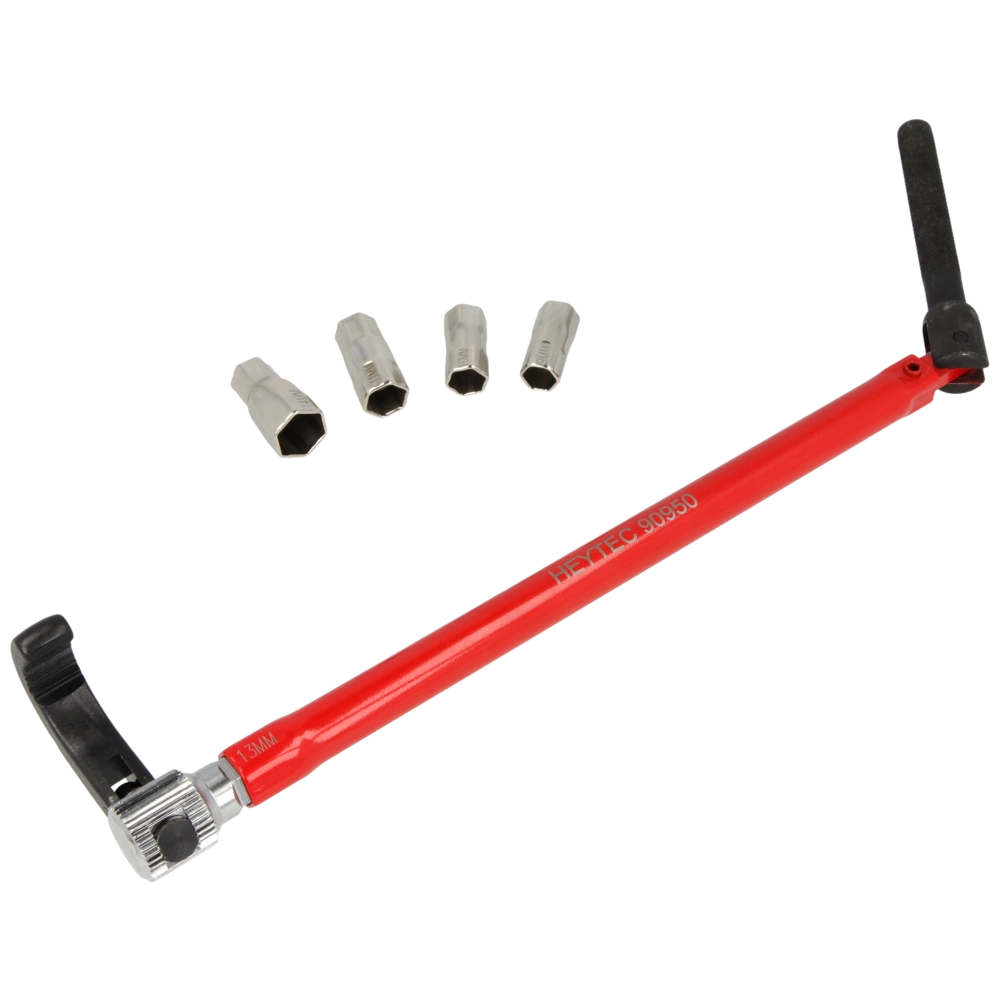 Standhahn-Mutternschlüssel aus robustem CV-Spezialstahl mit schwenkbarem Quergriff zum Anziehen und Lösen von Überwürfen und Muttern. Im Set sind Adapter für die Schlüsselweiten 9 / 10 / 11 /...