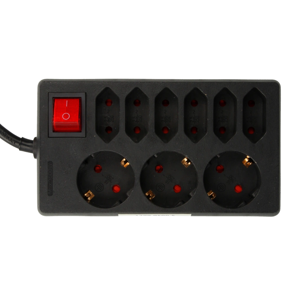 Steckdosenleiste mit 3 Schuko- und 6 Eurosteckdosen, Schuko-Winkelstecker und einpoligem, beleuchtetem Schalter. Die Schuko-Steckdoseneinsätze sind um 45° gedreht. Die Leiste verfügt über einen erhöhten Berührungsschutz...