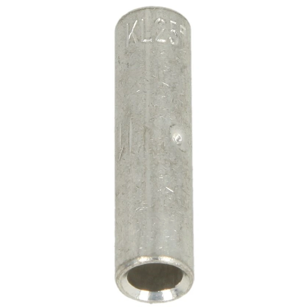 Verzinnter Stoßverbinder in Normalausführung mit besten Material- und Verpresseigenschaften für mehrdrähtige Rundleiter und rundgedrückte, mehrdrähtige Sektorleiter. Für einen exakten Kabeleinschub hat der Verbinder einen Mitteneindruck.