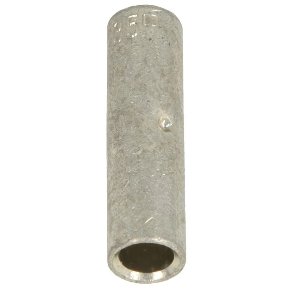 Verzinnter Stoßverbinder in Normalausführung mit besten Material- und Verpresseigenschaften für mehrdrähtige Rundleiter und rundgedrückte, mehrdrähtige Sektorleiter. Für einen exakten Kabeleinschub hat der Verbinder einen Mitteneindruck.