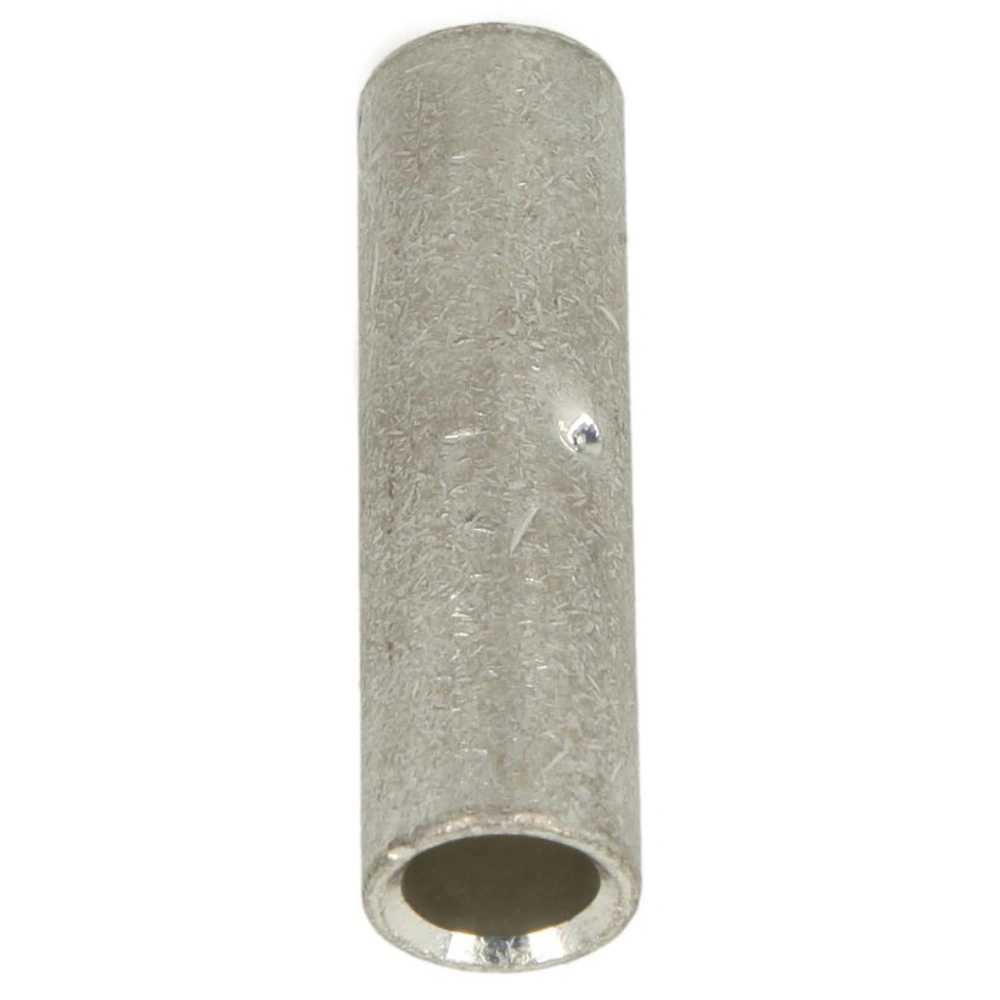 Verzinnter Stoßverbinder in Normalausführung mit besten Material- und Verpresseigenschaften für mehrdrähtige Rundleiter und rundgedrückte, mehrdrähtige Sektorleiter. Für einen exakten Kabeleinschub hat der Verbinder einen Mitteneindruck.
