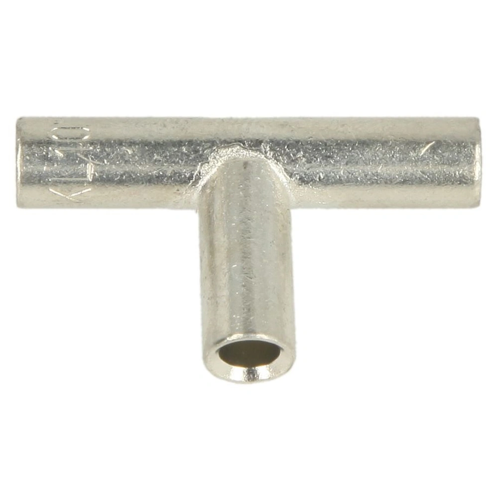 Verzinnter Stoßverbinder in T-Form mit besten Material- und Verpresseigenschaften für mehrdrähtige Rundleiter und rundgedrückte, mehrdrähtige Sektorleiter.