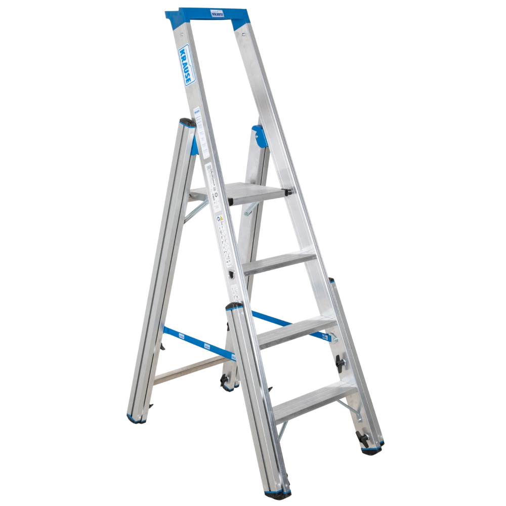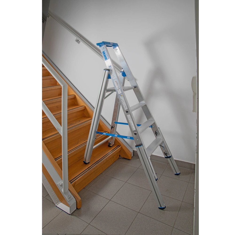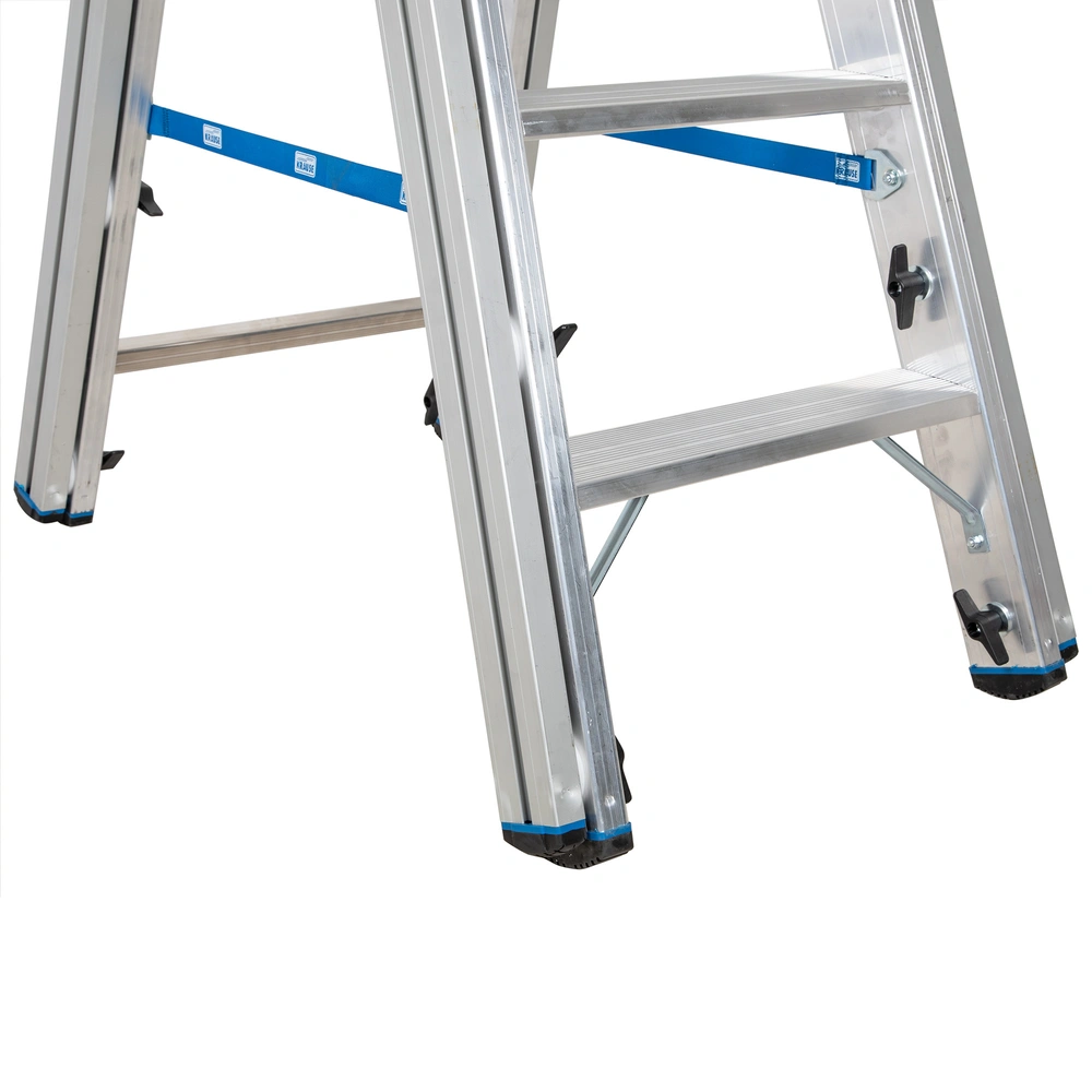 Robuste Aluleiter mit verstellbaren Holmverlängerungen für stabilen Stand auf Schrägen, Stufen und unebenen Untergründen. Jeder Holm lässt sich einzeln stufenlos einstellen. Damit ist ein fester Stand bei Unebenheiten und unterschiedlichen Ebenen garantiert. An der Werkzeugablage können zusätzlich Kabel und Eimer eingehängt werden. Breite rutschhemmende Stufen gewährleisten einen sicheren Aufstieg und bequemen Stand. Stabile Metall-Gelenkverbinder mit Klemmschutz, wetterfeste Gurte und der hohe Sicherheitsbügel zeichnen diese Leiter für den professionellen Einsatz aus.