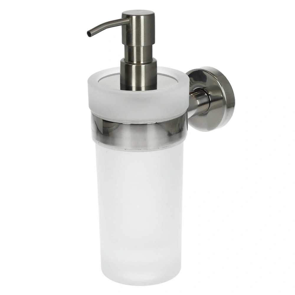 Seifenspenderhalter aus poliertem Edelstahl für die Wandmontage mit Kristallglasflasche und 200 ml PET-Seifeneinsatz.