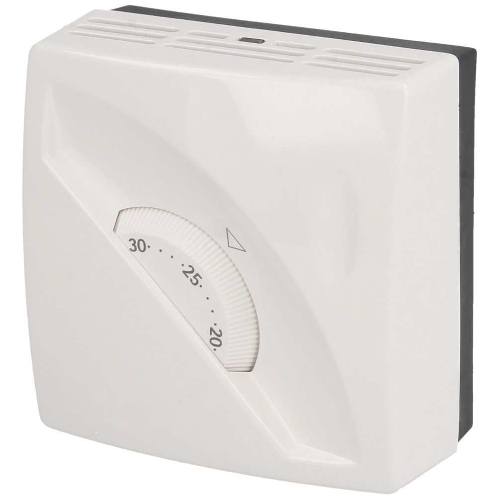Aufputz-Raumthermostat mit Temperaturwählscheibe. Der Einstellbereich des Regelkopfes kann intern begrenzt werden, um eine Fehlbedienung auszuschließen.