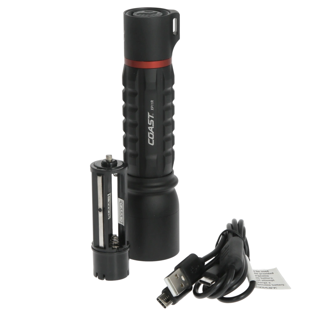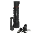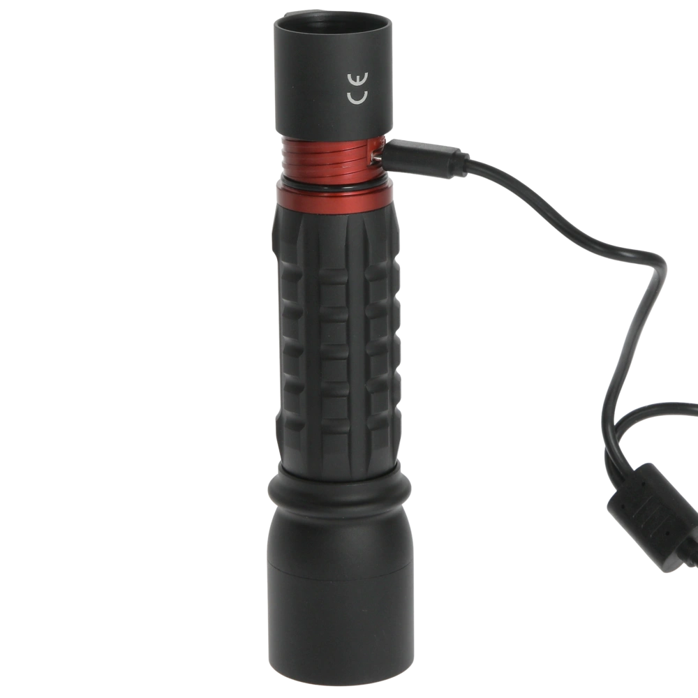 Wiederaufladbare Taschenlampe mit einem spritzwasser- und staubgeschützten Aluminium-Gehäuse. Die Leuchte lässt sich stufenlos von Flutlicht zu Spotstrahl fokussieren und kann in 3 Helligkeitsstufen verwendet werden.