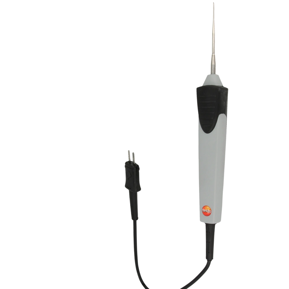 Alle ProduktinformationenSehr reaktionsschneller Tauch-/Einstechfühler (TE Typ K) mit dünner Sondenspitze und fest angeschlossenem Kabel für Temperaturmessungen in pastösen und halbfesten Medien, Flüssigkeiten und in der Luft.