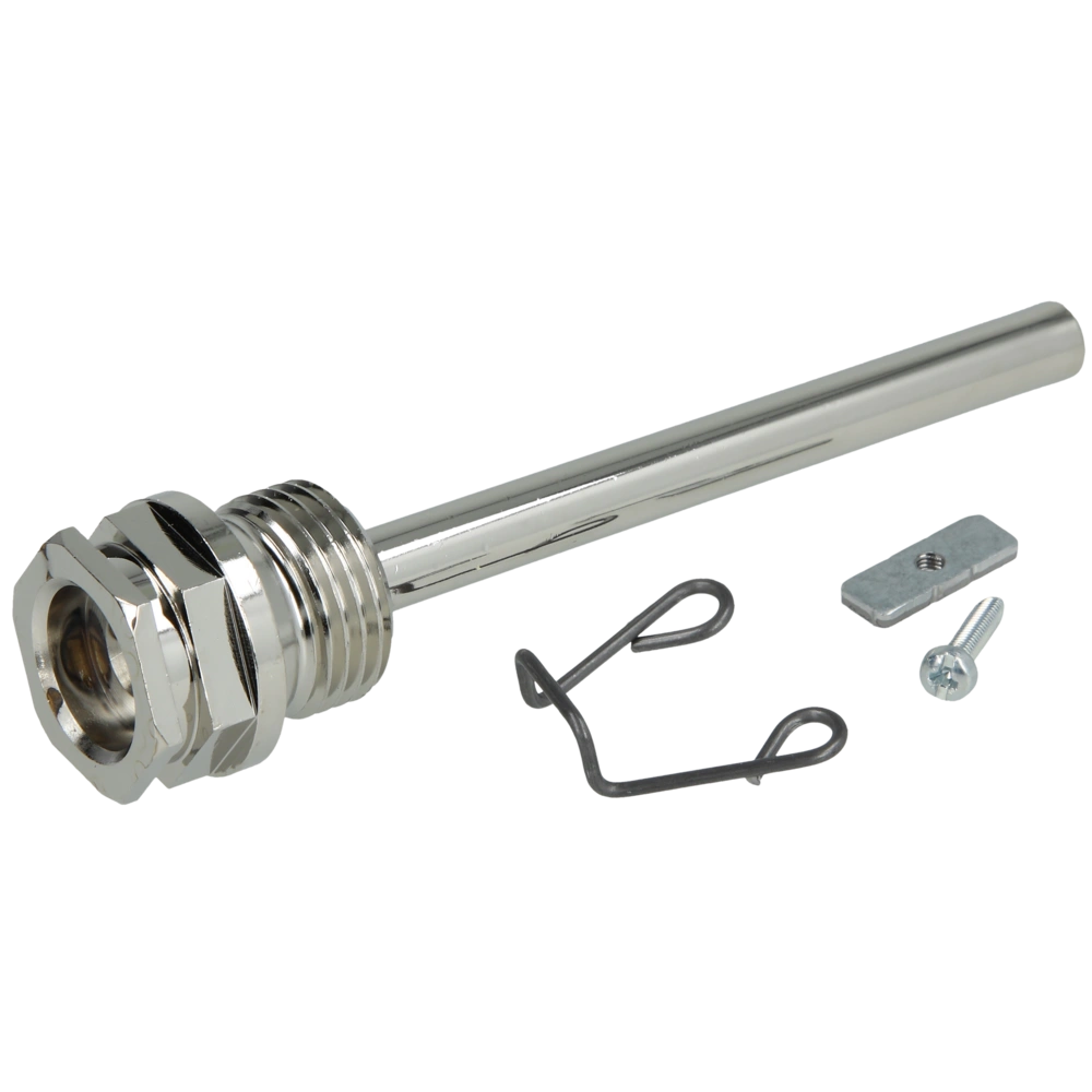 Tauchhülse/Schutzrohr für Fühler. Technische Daten: - Anschluss: G 1/2" x 100 mm - Material: Messing vernickelt Hinweis: Ausführungen nicht für Artikel 211213076 und 211213196