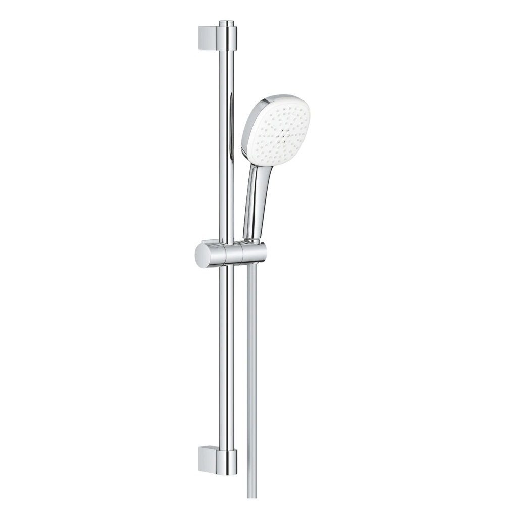 Brausestangenset mit zwei verschiedenen Strahlarten und eckigem Brausekopf. Der umlaufende Silikonring schützt die Handbrause zuverlässig vor Beschädigungen beim Herunterfallen. Die Oberfläche der...