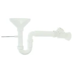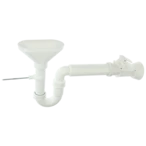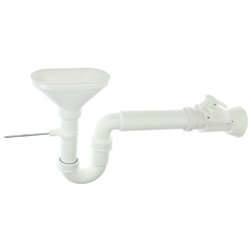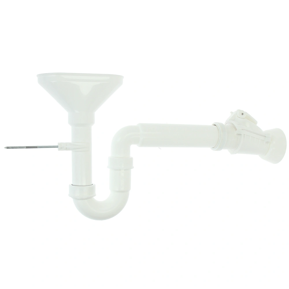 Siphon aus weißem Polypropylen mit Auffangtrichter für Leckwasser, Wandhalterung und Rückstauverschluss nach DIN 13562.
