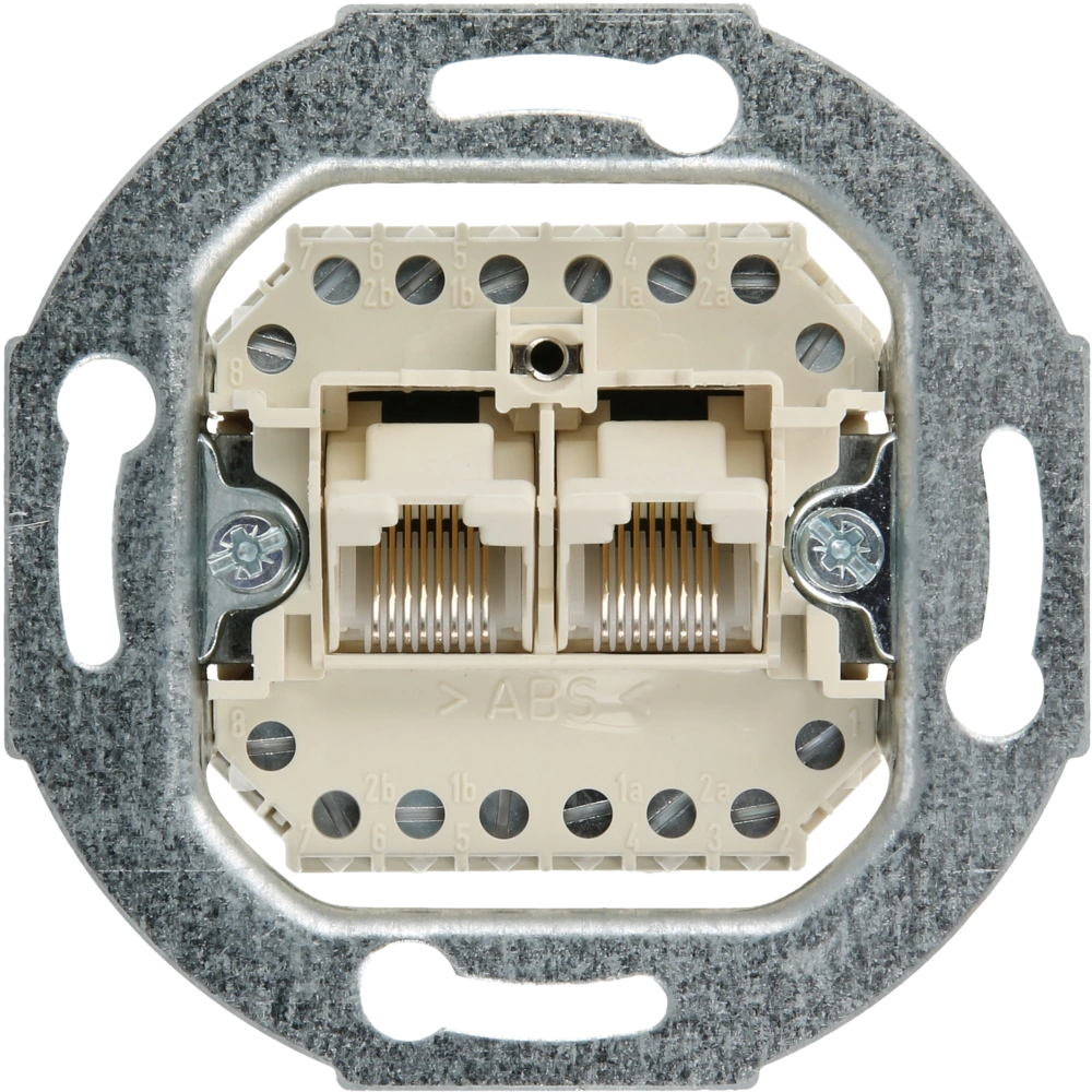 ISDN-fähiger UAE-Anschlussdosen-Einsatz mit zwei Schrägauslässen für 8-polige Stecker.