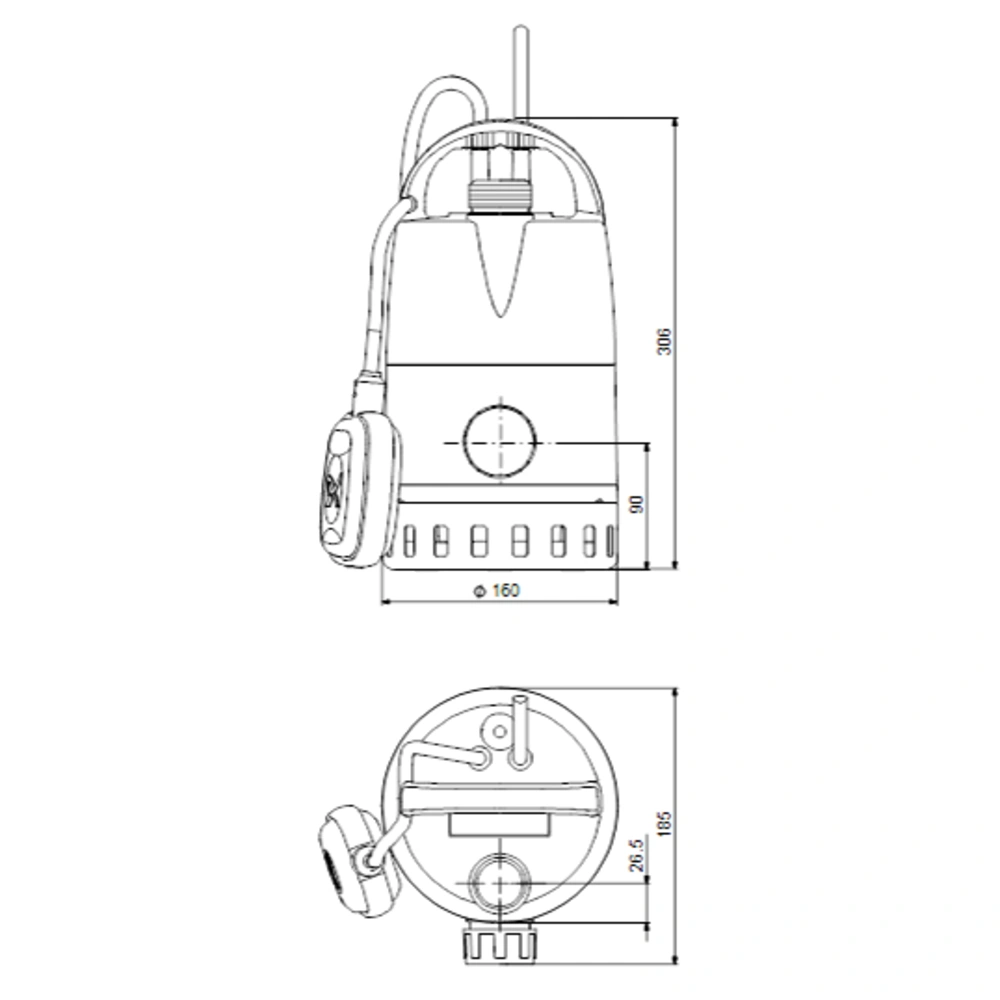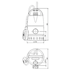 Tauchmotor mit eingebauten Thermoschalter als Motorschutz bei Trockenlauf und Blockierung. Netz- und Schwimmerschalterkabel mit thermetischer Abdichtung zum Motor. Verstellbare Schaltpunkte über Schwimmerschalterfixierung am Griff.