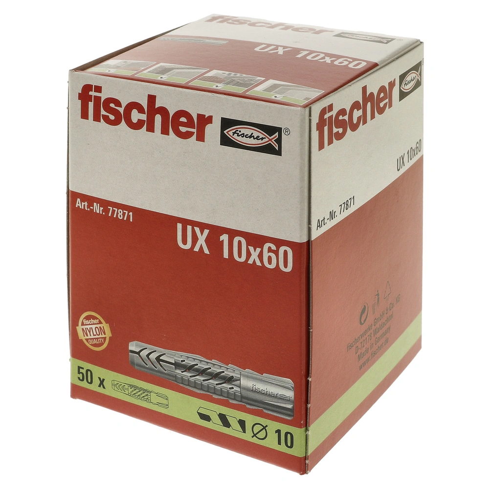 Universaldübel zur Durchsteckmontage für nahezu alle Baustoffe. Der Dübel verspreizt in Vollbaustoffen und verknotet sich in Hohl- und Plattenbaustoffen und sorgt dadurch für einen maximalen Halt. Die schrägen Verbindungsstege sorgen für eine optimale Schraubenführung. Durch seine sägezahnförmigen Verdrehsicherungen, dreht sich der Dübel im Bohrloch nicht mit, so wird die größtmögliche Montagesicherheit gewährleistet.
