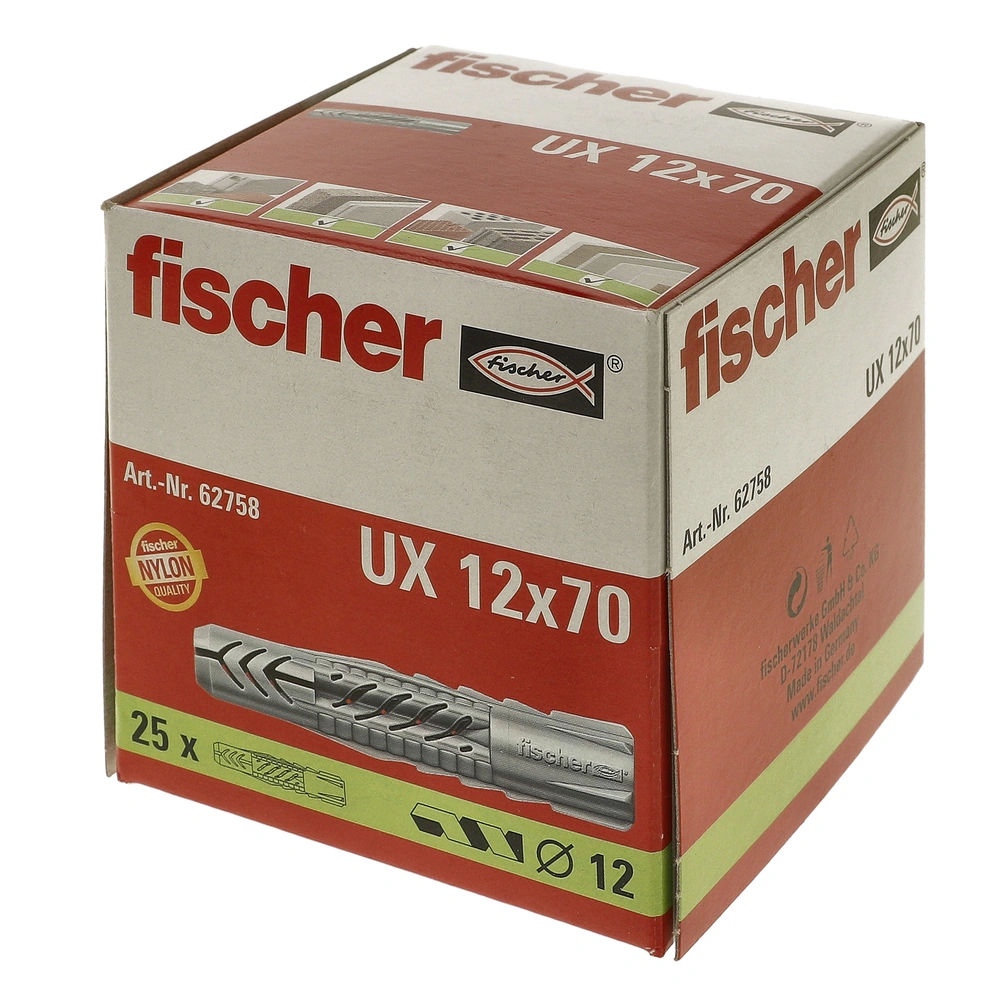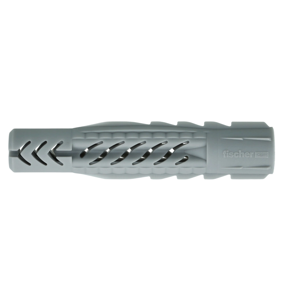 Universaldübel zur Durchsteckmontage für nahezu alle Baustoffe. Der Dübel verspreizt in Vollbaustoffen und verknotet sich in Hohl- und Plattenbaustoffen und sorgt dadurch für einen maximalen Halt. Die schrägen Verbindungsstege sorgen für eine optimale Schraubenführung. Durch seine sägezahnförmigen Verdrehsicherungen, dreht sich der Dübel im Bohrloch nicht mit, so wird die größtmögliche Montagesicherheit gewährleistet.