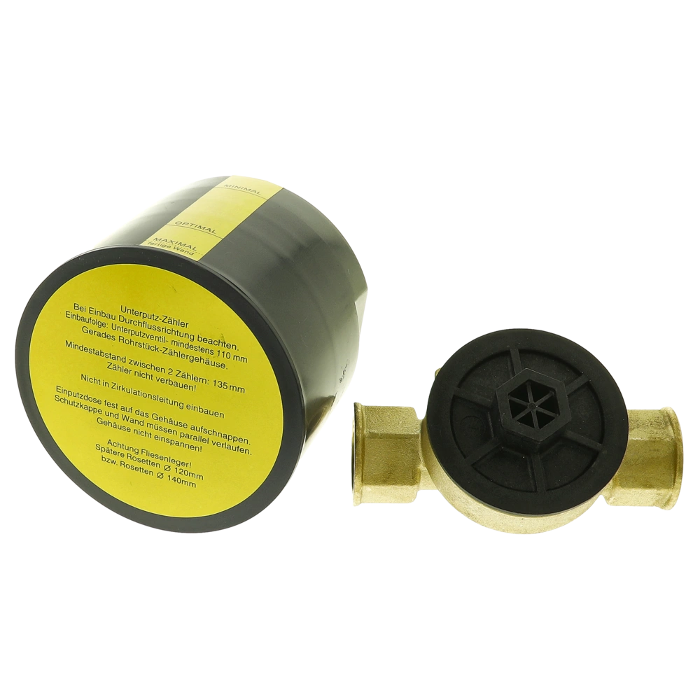 Unterputzgehäuse für Koaxial-Mehrstrahlzähler in niedriger Ausführung mit Gewindeanschluss. Der Messing-Verschlussdeckel ist mit einem O-Ring und einer Einputzhilfe versehen.