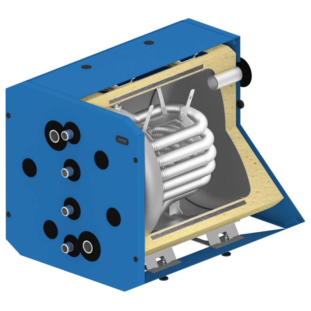 Ce ballon est un stockage d'eau douce. L'eau potable circule à travers un échangeur de chaleur en acier inoxydable et est ainsi chauffée.