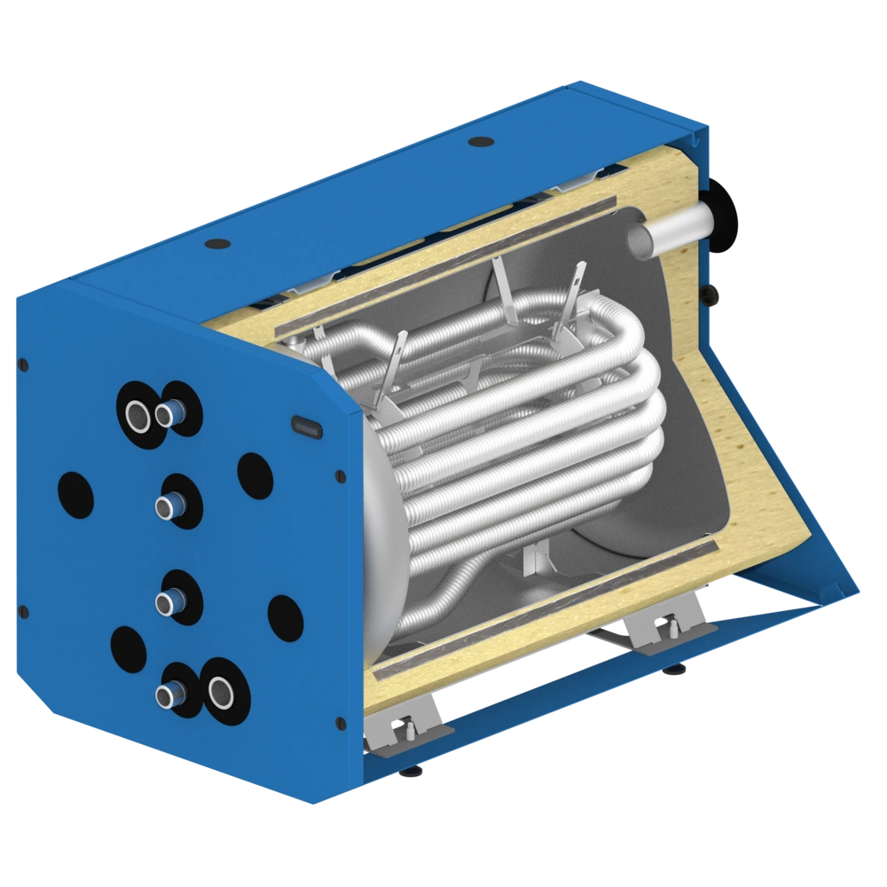 Ce ballon est un stockage d'eau douce. L'eau potable circule à travers un échangeur de chaleur en acier inoxydable et est ainsi chauffée.