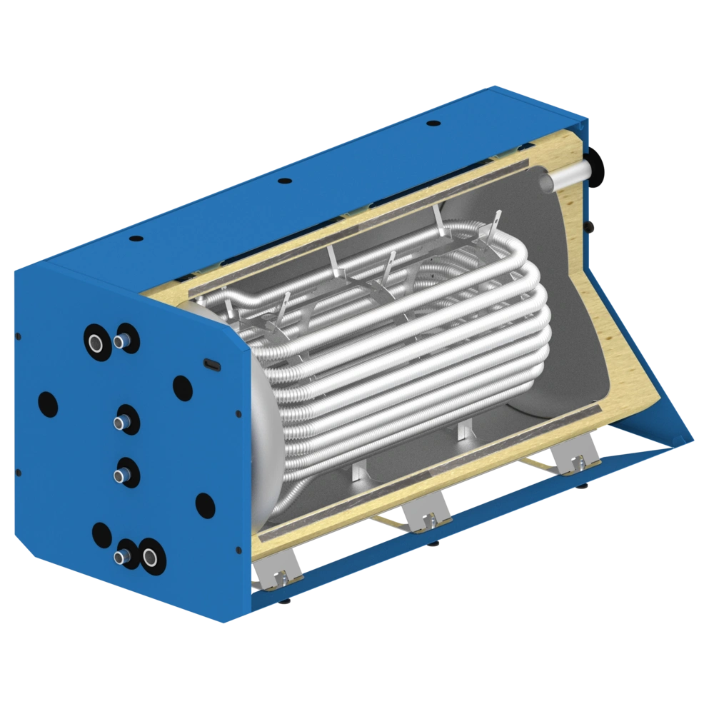 Ce ballon est un stockage d'eau douce. L'eau potable circule à travers un échangeur de chaleur en acier inoxydable et est ainsi chauffée.