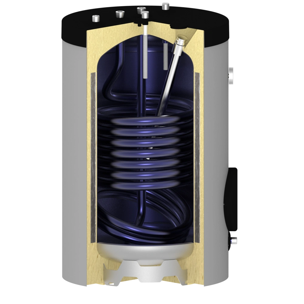 Le réservoir est en acier S235JR émaillé, l'echangeur est en acier S235TR1.