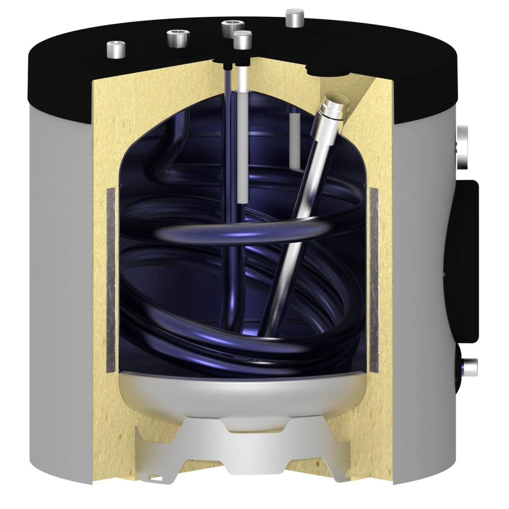 Le réservoir est en acier S235JR émaillé, l'echangeur est en acier S235TR1.