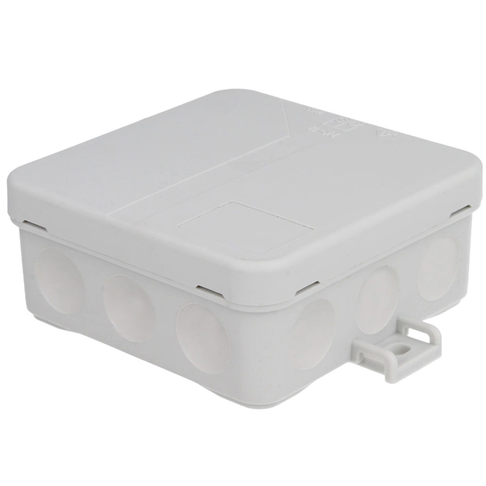 Verbindungsdose nach DIN EN 60670 (VDE 0606) geprüft hat 12 seitliche Einführungen und 2 Bodeneinführungen mit selbstdichtenden, weichen Membranen. Außenliegend sind die Befestigungspunkte.