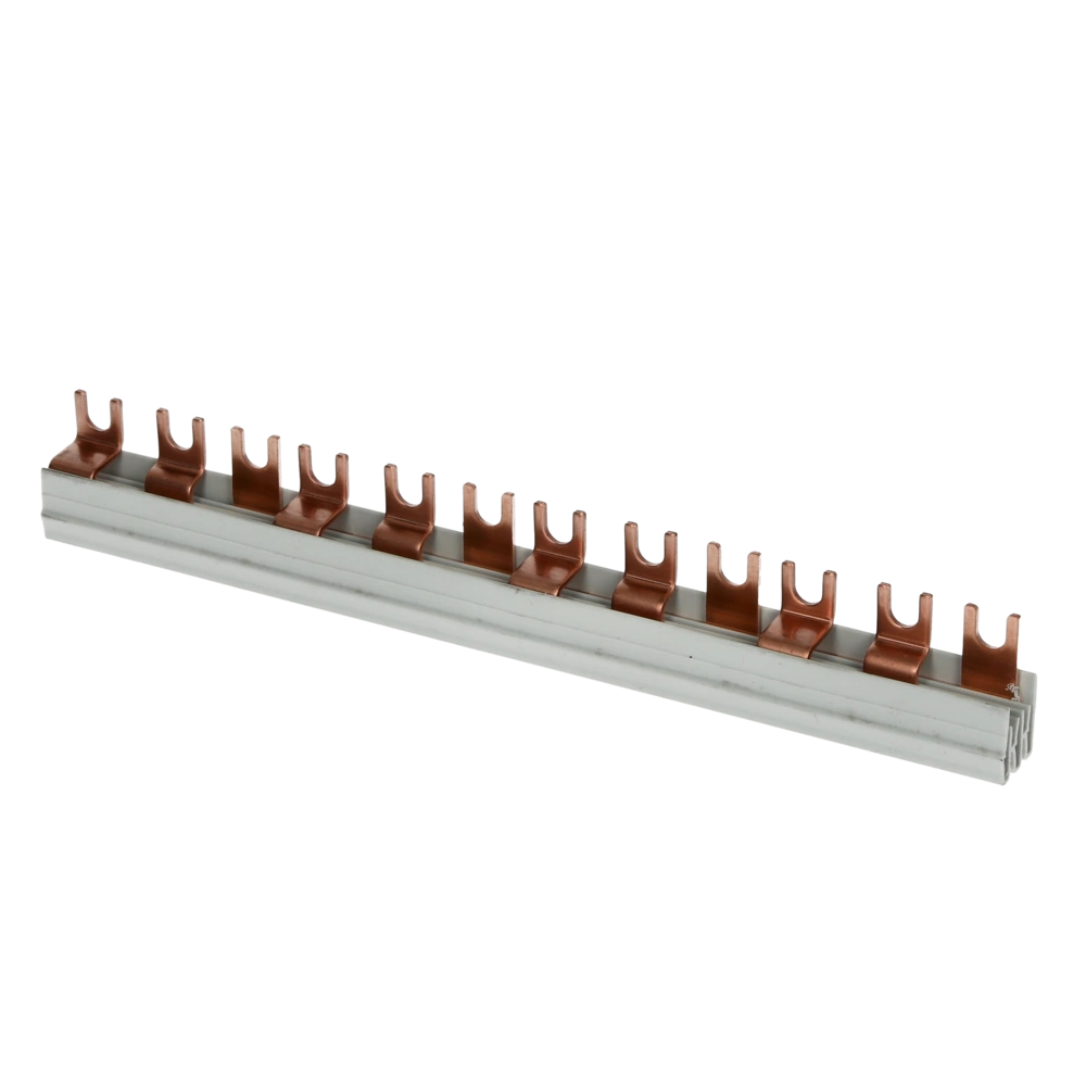 Die Phasenschiene mit Dreileitersystem ist zur einfachen und schnellen Einspeisung von Sicherungsautomaten. Die Länge kann beliebig gekürzt werden. Nach dem Kürzen einfach die Schienenenden durch