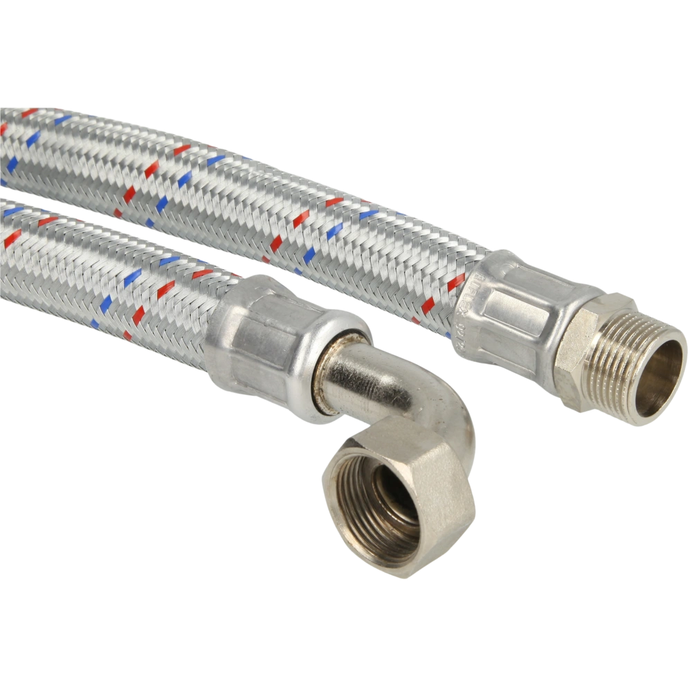 Der Schlauch verfügt über eine verzinkte Stahldrahtumflechtung, eine EPDM-Seele und eine Überwurfmutter aus vernickeltem Messing.