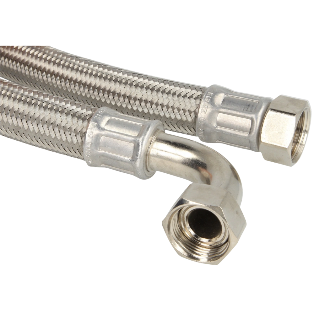 Der Schlauch verfügt über eine verzinkte Stahldrahtumflechtung, eine EPDM-Seele und eine Überwurfmutter aus vernickeltem Messing.
